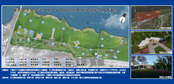 项目位于博罗县罗阳镇东江大堤南堤,北邻东江,南临江南大道,西临博罗大桥。项目建设内容包括:场地清表、清杂、土方平整、碧道、驿站、运动场地、桥梁、园建(园路、景观小品、服务设施、绿化、绿化给排水及景观照明)等。